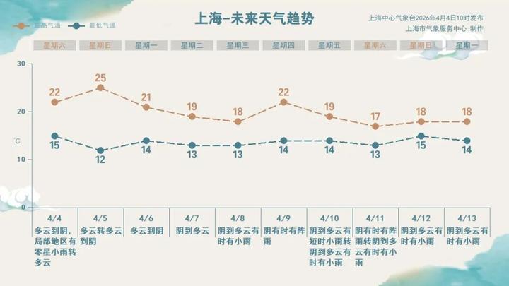 天气趋势:明天清明节当天,上海白天为多云天气,夜里起云系增多,最高气温有望冲上25℃。假日期间申城体感舒适,适宜祭扫、出游、洗晒。天气干燥,注意用火用电安全,户外活动防晒补水不可少。下周二申城阴到多云天气为主,周三起多阵雨或短时小雨。气温方面,假期结束后气温稍有回落,在13~22℃之间波动。
