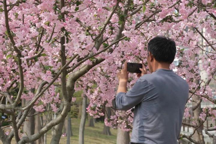 阳光透过花枝,洒落斑驳光影,不少市民举着手机、相机在花间小径驻足拍照。“这里的海棠开得像瀑布一样,而且树形自然不呆板,拍出来特别好看。”附近居民张女士说。