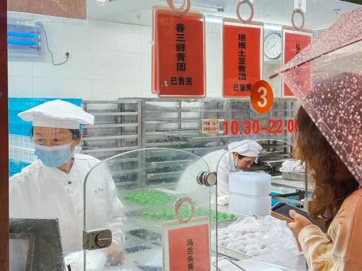 昨晚,一场淅淅沥沥的春雨,并未浇灭上海人对青团的执念。八点多,记者来到南京路步行街上的沈大成总店,眼前的景象让人动容——外卖窗口前、雨棚下挤满了撑着伞的人群,雨水打湿了衣角,却挡不住大家抢购青团的热情,这便是上海老字号最动人的烟火气。