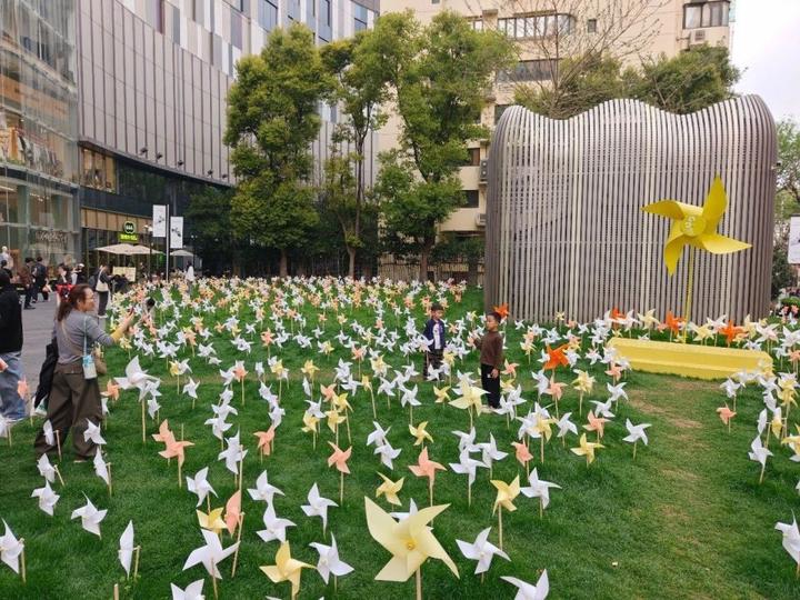 清明假期,申城商圈人气旺。cp静安在户外草坪打造“等风来”主题风车海景观。 新民晚报记者 刘歆 摄