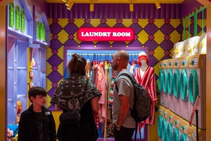 在安福路上,韩国潮牌Wiggle Wiggle中国首店同样人气火爆。店铺以多巴胺风格为主调,四层空间各有主题,红黄明快配色搭配悬空小熊、笑脸花装饰,宛如一座梦幻乐园,成为热门打卡点。店内帆布袋、手机壳、抱枕毯等萌系文创与家居用品琳琅满目,四楼浴室主题空间与90度侧身房更是吸引游客频频拍照分享。
