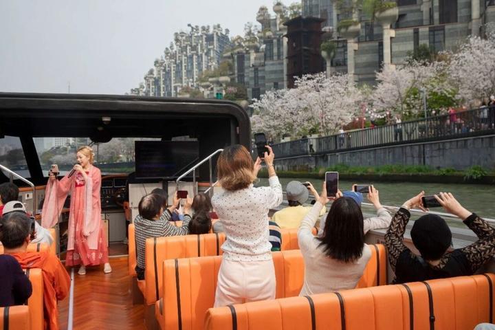 今年,悠游苏州河与天安千树携手推出新一季“千树樱花季”活动,将水岸风光、现场演艺、文创市集、商圈消费串成一条沉浸式游玩线,让游客从“打卡拍照”变成“全程沉浸”。4月4日,苏州河游船开出55班散客航班,上座率89%,创下2022年开航以来单日最高纪录;樱花主题航班22班售出426张票,上座率93%,演艺航班更是座无虚席。