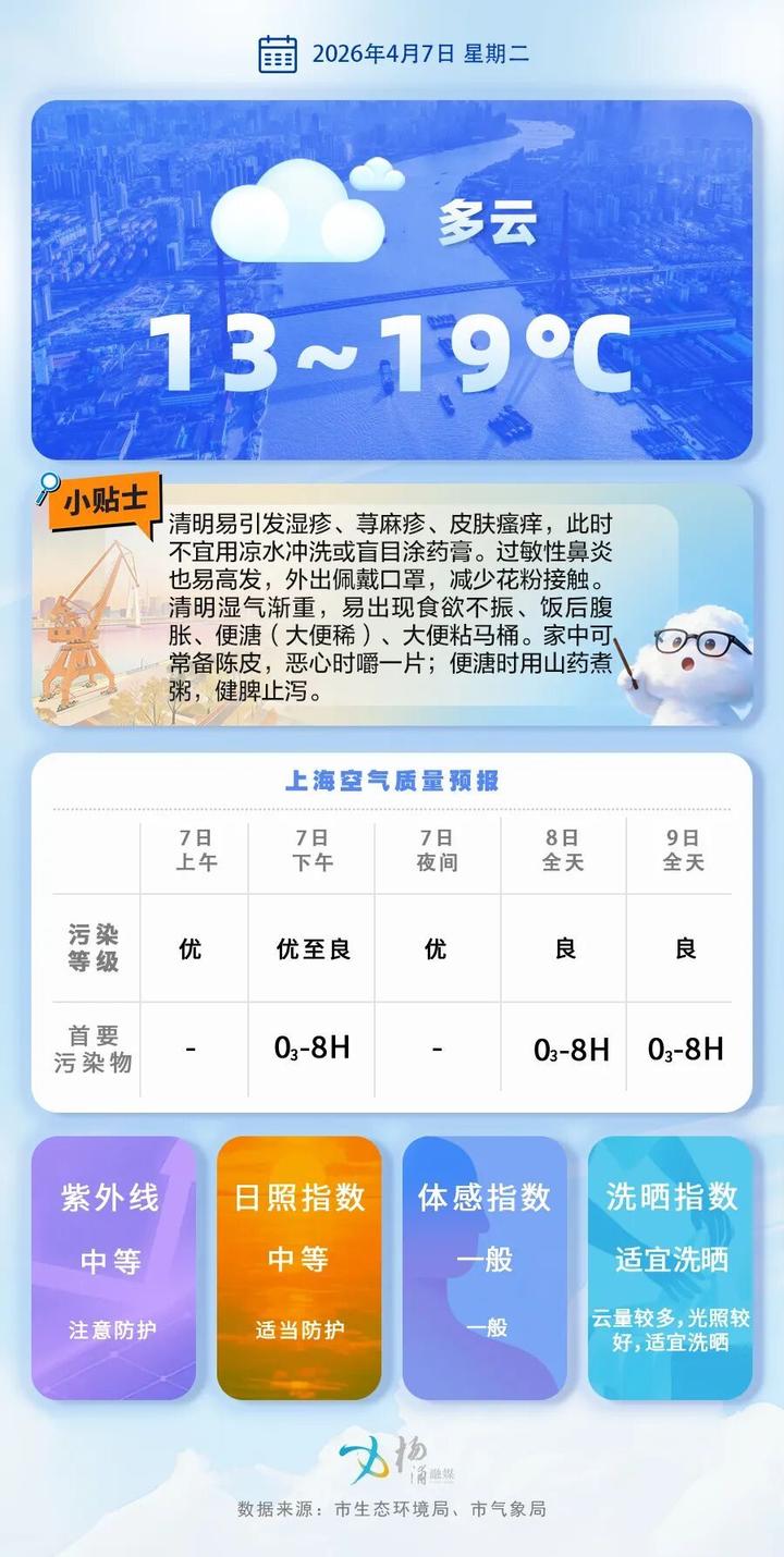 上海中心气象台预计,明日受弱冷空气扩散影响,本市天气以多云到阴为主,气温略有下降,预计在14~24℃左右。假期过后,本市迎来降水天气过程,气温起伏不大,整体在13~24℃。春季天气多变,提醒市民朋友们及时关注预报信息,做好生活及出行安排。