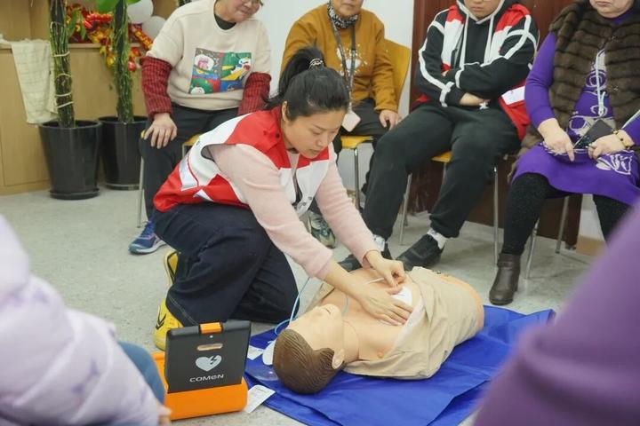 青团蒸熟间隙,“急救微课堂”同步开讲。街道红十字会老师结合老年群体常见应急场景,用通俗语言讲解心肺复苏、AED使用等实用知识,现场演示操作流程,指导老人们模拟练习,细致解答各类疑问,确保老人们听得懂、学得会、用得上,为老人的生命安全筑牢防线。