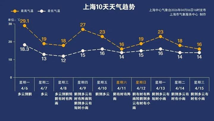 周三起,西南暖湿气流变得活跃,上海多阴雨过程。周三后期及周六雨水较明显,降雨间歇期可能出现低能见度天气,大家注意道路交通安全。气温波动较大,其中周四气温较高,最高可达27℃,而周六最高仅有16℃。春季天气变化快,大家要多多留意临近的天气变化,合理安排生活及出行。