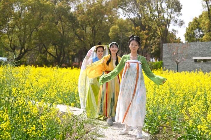 不远处,汉服巡游队伍款款而来,身着汉服的小姐姐们,成为花田中的另一道风景。姜煜恒介绍,为了让巡游更具仪式感,团队还邀请专业花艺师现场指导春幡制作,准备了新鲜花枝、古风扇子、丝带等材料,以插花的形式打造与汉服配套的手持摆件。参与者们手持亲手制作的春幡,身着襦裙、衣袂飘飘,在花田间漫步,金黄的花海与素雅的汉服相映成趣,恍若穿越千年。“春幡是春日的传统信物,搭配汉服巡游,既能让大家感受服饰之美,也能传递传统文化的韵味。”姜煜恒说。