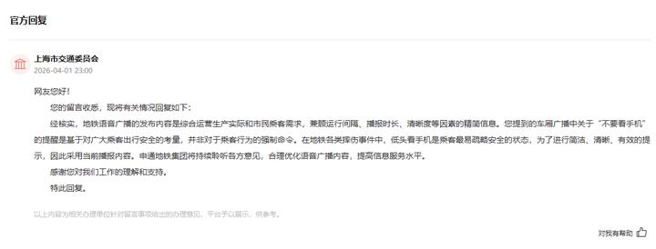 对此,上海市交通委员会回复称,地铁语音广播的发布内容是综合运营生产实际和市民乘客需求,兼顾运行间隔、播报时长、清晰度等因素的精简信息。对于该网友提到的车厢广播中关于“不要看手机”的提醒是基于对广大乘客出行安全的考量,并非对于乘客行为的强制命令。