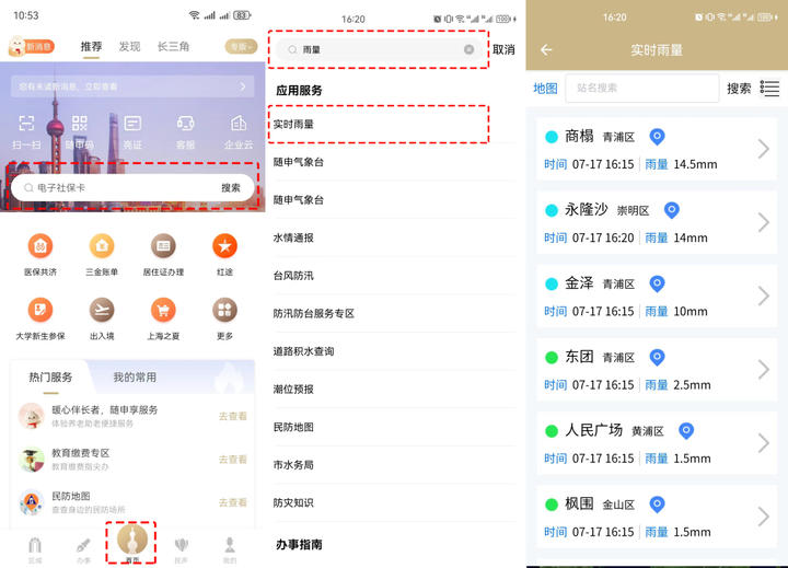 上“随申办市民云”APP的“实时雨量”服务,上海全市雨量实时知晓!