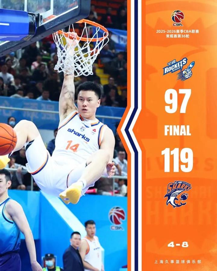 4月8日,2025-2026赛季CBA联赛常规赛第36轮,上海男篮119-97宁波男篮,斩获17连胜,刷新队史第二长连胜纪录,仅次于2001-2002赛季的23连胜。