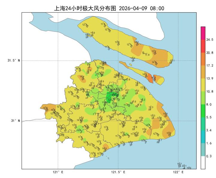 昨天上午阳光开场,下午云系增多。各区最高气温定格在16~21℃之间,市区徐家汇站19.8℃。全天风力较强,截至9日08时,全市陆上大半地区出现6级以上阵风,以浦东万祥镇8级(17.3米/秒)为最大。