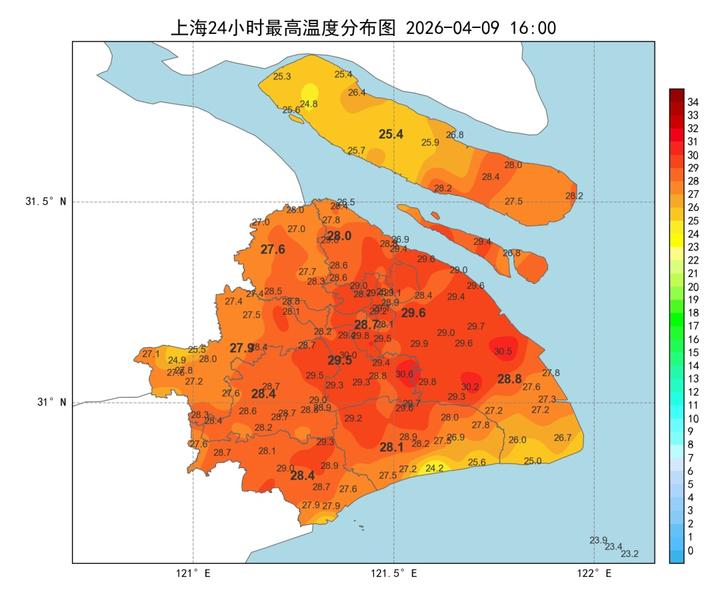 其中浦东站29.6℃为全市最高