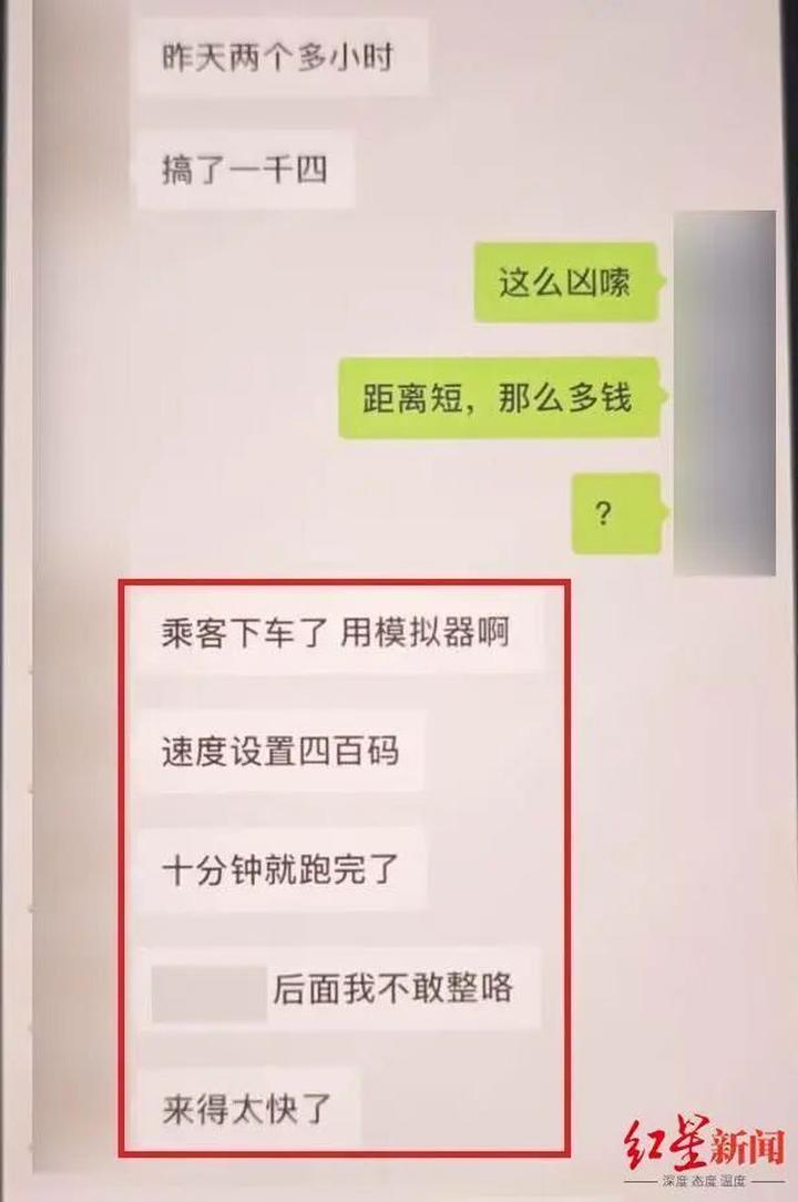聊天记录显示,有网约车司机称“乘客下车了,用模拟器啊,速度设置四百码,十分钟跑完了”“两个多小时搞了一千四(元)”“后面我不敢整咯,(钱)来得太快了”。