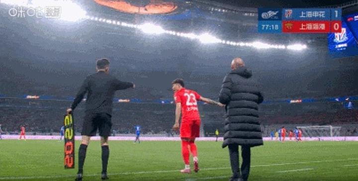 第78分钟,海港第四次换人,裁判认定杨世元头部受伤,傅欢替补登场。