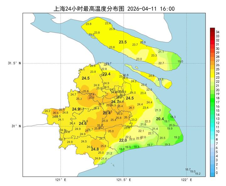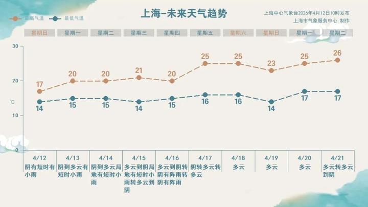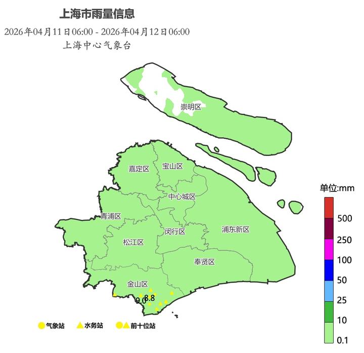 昨天上午是多云到阴的天气,中午开始逐渐转雨。全天温差较小,市区徐家汇站全天在14.3~19.5℃之间。