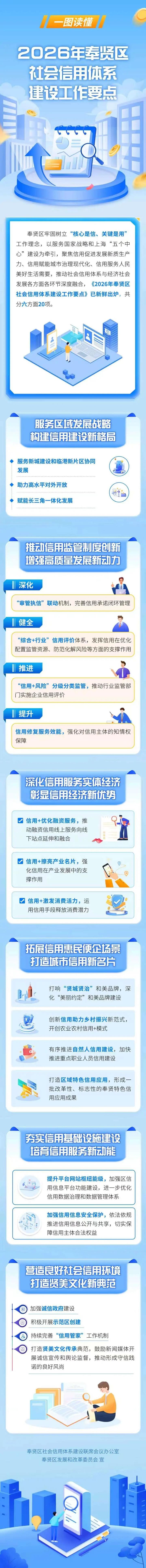 奉贤区牢固树立“核心是信、关键是用”工作理念,以服务国家战略和上海“五个中心”建设为牵引,聚焦信用促进发展新质生产力、信用赋能城市治理现代化、信用服务人民美好生活需要,推动社会信用体系与经济社会发展各方面各环节深度融合,《2026年奉贤区社会信用体系建设工作要点》已新鲜出炉,共分六方面20项。