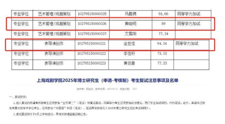此前,2025年5月12日,上海戏剧学院官方发布了2025年博士研究生的复试名单,有网友在名单中发现了黄晓明,这也意味着其已经通过了初试。