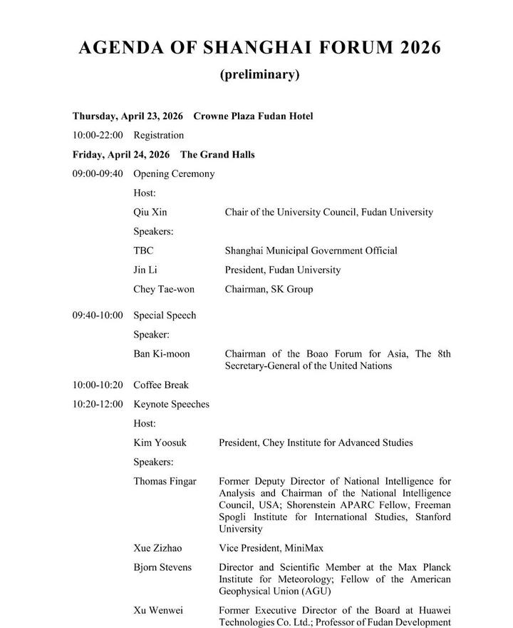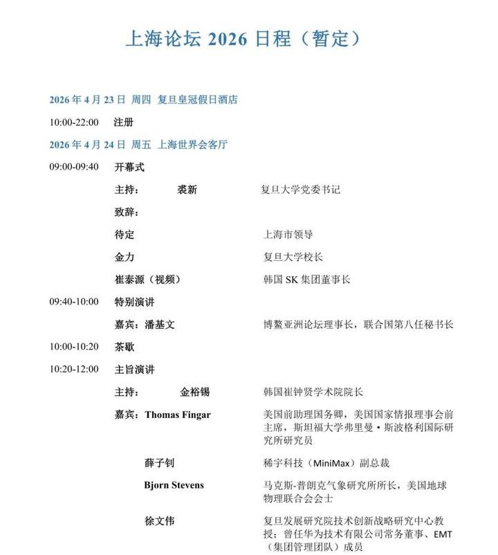 开幕式嘉宾堪称重量级:博鳌亚洲论坛理事长、联合国第八任秘书长潘基文将做特别演讲;美国前助理国务卿、美国国家情报理事会前主席、斯坦福大学弗里曼·斯波格利国际研究所研究员冯稼时(Thomas Fingar),稀宇科技(MiniMax)副总裁薛子钊,马克斯-普朗克气象研究所所长、美国地球物理联合会会士Bjorn Stevens,全球产业组织(GIO)创始人及主席、复旦发展研究院技术创新战略研究中心教授、曾任华为技术有限公司常务董事及EMT(集团管理团队)成员的徐文伟将先后发表主旨演讲,嘉宾覆盖国际组织、外交、学术、科技产业等多元领域,全方位、多维度解读时代命题。