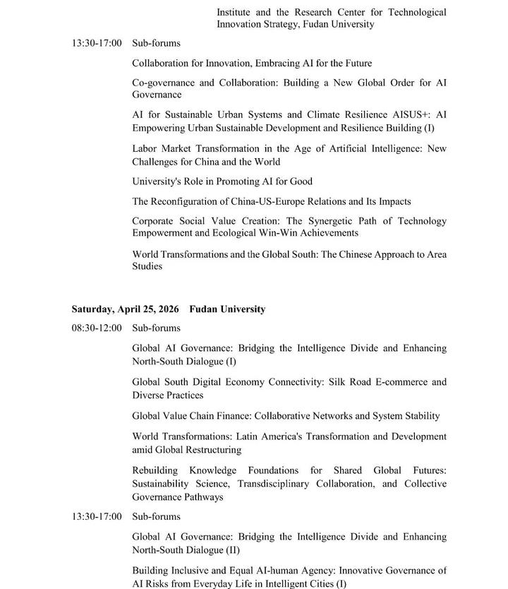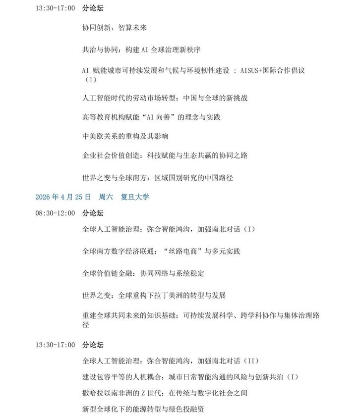 同样精彩的还有贯穿4月24至26日的17场分论坛,分属人工智能与全球治理、大国关系与区域治理、可持续发展与共同未来三大核心板块;各分论坛紧扣全球发展难点、热点议题,打破学科壁垒与领域边界,展开跨学科、多领域的深度研讨,为重构全球治理新秩序提供务实且多元的解决方案。(详见文末《上海论坛动态》)
