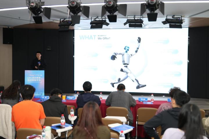 北大临港科创中心品牌宣传总监张楠现场开展“滴水湖全球OPC人工智能挑战赛”报名宣介。张楠详细解读了本届赛事的赛程设置、评审规则、配套扶持政策与参赛核心优势,鼓励OPC团队将所学路演技巧应用于实战,在竞技环境中检验并迭代商业计划,实现以赛促练、以赛促创。
