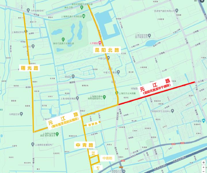 临时走向:元江路(华宁路—元松路)改走中央隔离南侧车道(颛桥地铁站向富凯路银林路方向)。