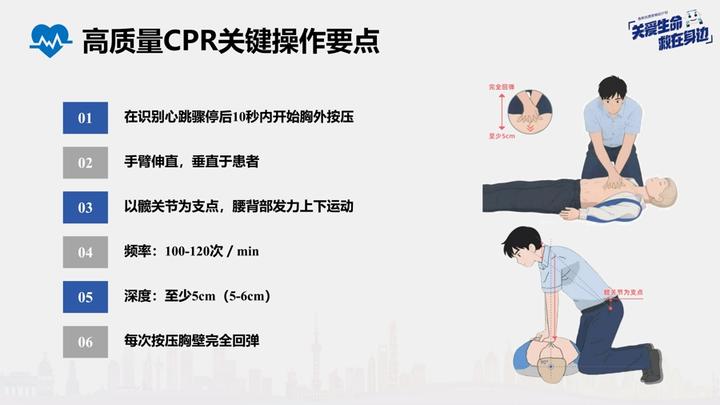 其中,高质量胸外按压有着严格的操作规范。施救者需保持手臂伸直,手臂与患者胸壁保持垂直,以髋关节为支点、依靠腰背部力量发力进行按压;按压频率需稳定在100—120次/分钟,按压深度达到5—6厘米,且每次按压后都要让胸廓完全回弹。