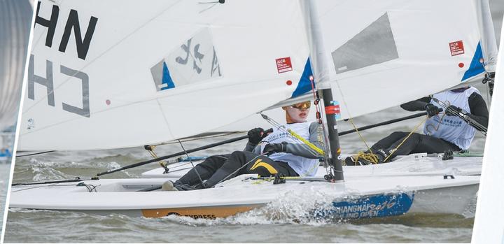 ILCA6级帆船比赛中,中国参赛选手熟练地控制船帆和船舵,劈风前行尽显风采。