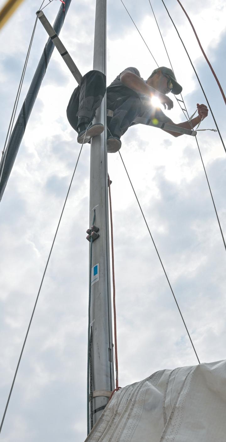 参加J80级帆船比赛的环世物流2队队员在赛前准备时爬上帆船桅杆调整设备。