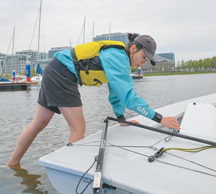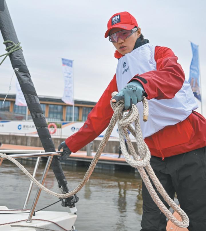 奥运冠军徐莉佳担任“赛事领航官”,她率领的莉佳航海队参加J80级帆船比赛。离开码头前,她在船上做赛前准备工作。