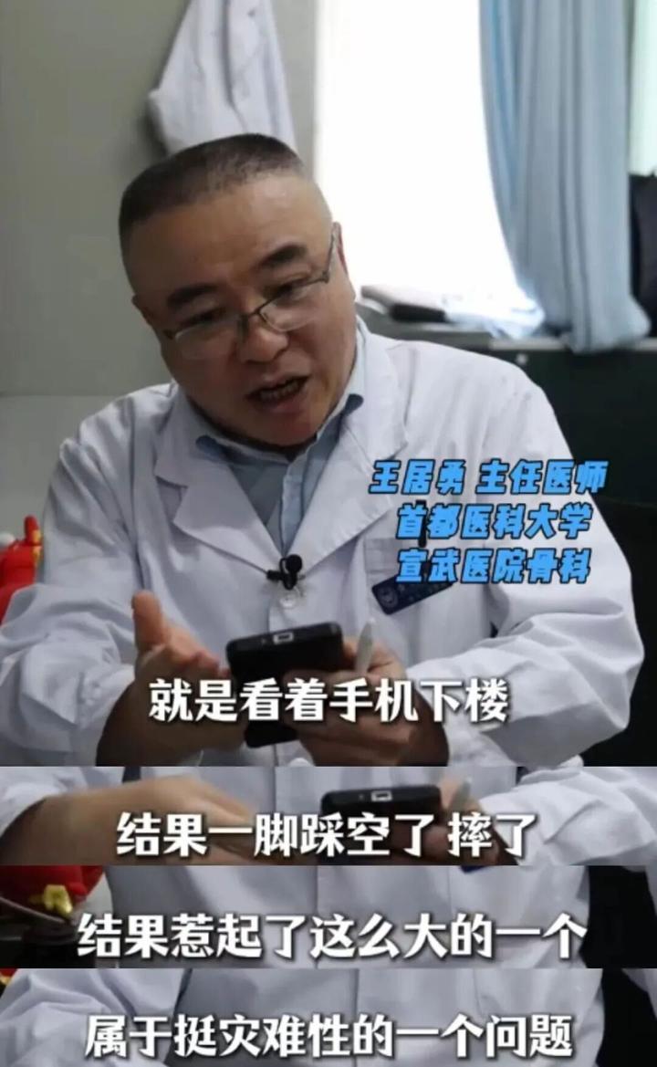 首都医科大学宣武医院骨科主任医师王居勇介绍,这是一例典型的急诊病例,患者年仅25岁,悲剧的起因就是下楼时专注看手机,忽视了脚下的台阶,一脚踩空导致摔倒。“本来是一件微不足道的小事,最终却引发了灾难性的后果。”
