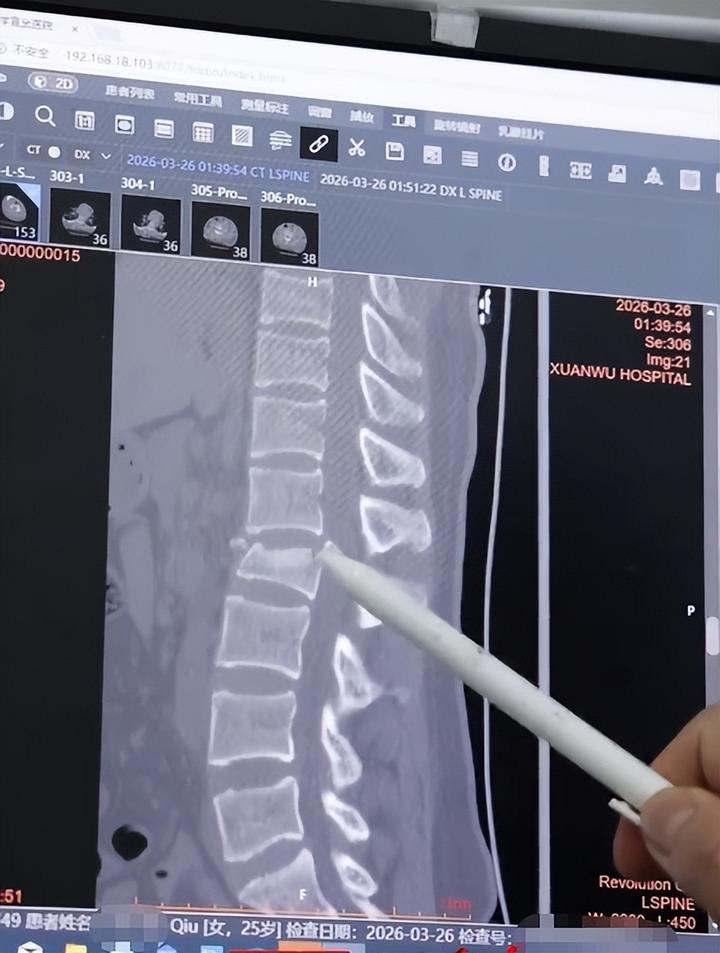王居勇进一步解释,小秋的腰椎骨头已被压塌,更危险的是,一块骨块向后移位,直接挤压进神经管,原本完整的神经管被挤得只剩约1/3宽度,“这很容易引发下肢功能异常,目前她已经出现肛门括约肌收缩无力、大小便控制不佳的症状,情况十分危急。”