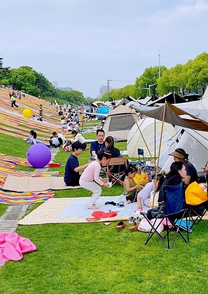 帐篷内,朱女士和家人一边享用美食,一边看着6岁女儿开心地在草坪上滑来滑去,这已是他们一家第四次来这里“打卡”了。