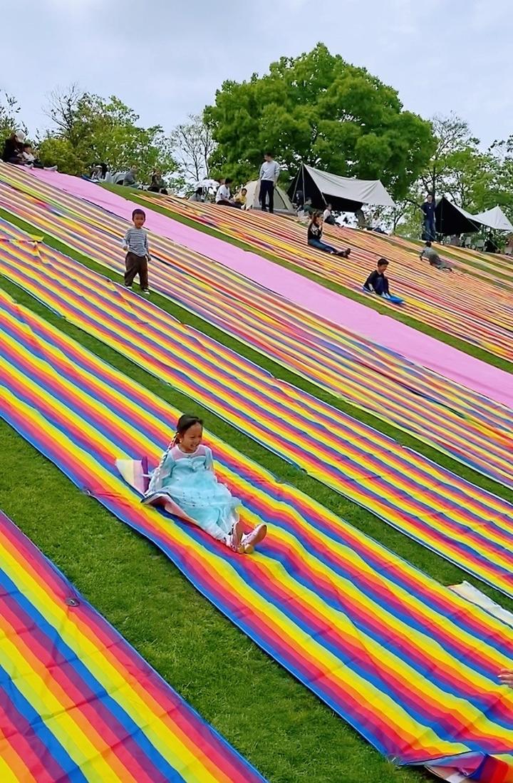 网红滑草坡人气有多高?4月8日中午,记者在现场看到,面向浦星公路一侧,这里已被数百条彩虹色的滑草布铺满,有的布还未完全铺好,心急的孩子们已经“哧溜哧溜”滑起来。五颜六色的帐篷和气球分布在草坪各处,场面颇为壮观。