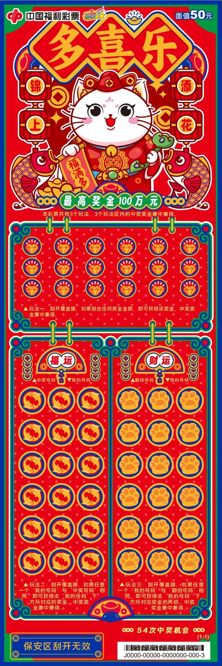 票面以传统红为底色,搭配吉祥的金币元素与萌趣国潮卡通形象,“多喜乐”将千年喜庆文化融入现代设计美学。票面锦鲤环绕、金元宝点缀,刮开瞬间仿佛开启装满祝福的宝盒,既有喜庆祝福的氛围,又不失潮流和趣味性。