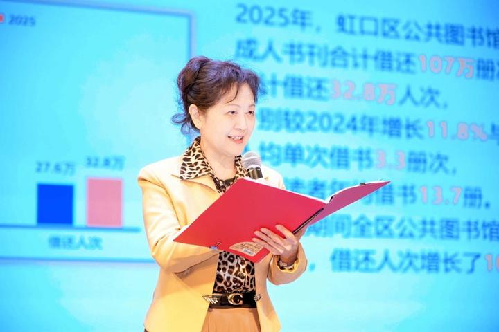 2025年,虹口区公共图书馆共借还成人书刊107万册次,借还读者32.8万人次,分别较2024年增长了11.8%和18.8%;全区公共图书馆共举办面向成人的阅读文化活动1015场,参与60.3万人次。