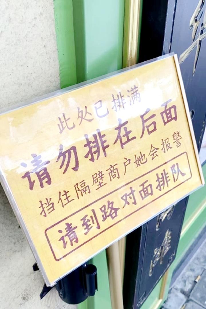 近日,有市民发现,上海老牌生煎店“复牌”后,门外出现了许多黄底黑字的告示牌,其中一个牌子颇为引人注意,上面写着:“请勿排在后面,挡住隔壁商户她会报警,请到马路对面排队。”