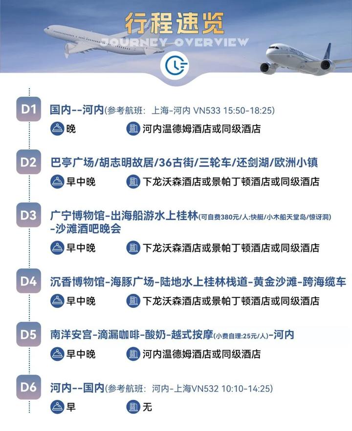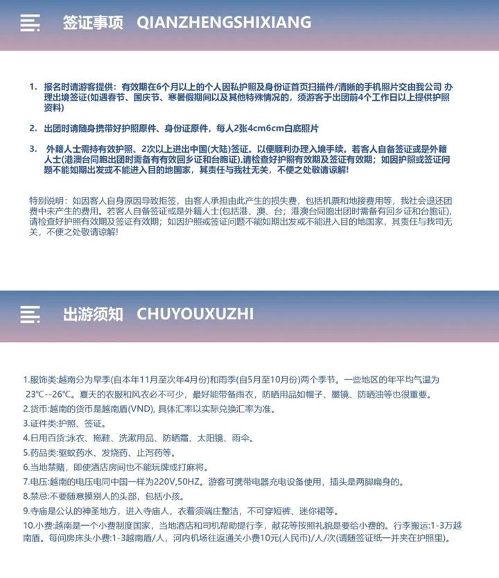 3、酒店:境外酒店二人/间,单人住宿需补单房差(因越南酒店紧俏,酒店以同等级安排,恕不接受指定酒店及房型;当地部分酒店不挂星,默认11周岁以下儿童不占床;床型不保证,视当天酒店入住情况而定);