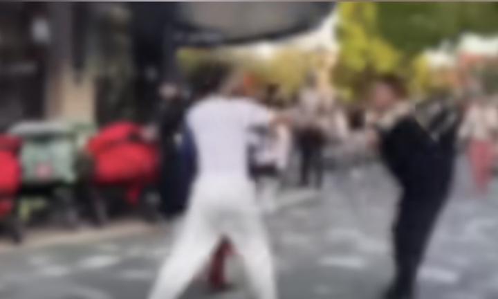 记者从社交平台上流传的视频中看到,4月26日上海迪士尼小镇某商店门口,一游客发现黑衣男子在婴儿车旁吸烟后上前提醒,未料这名黑衣男子情绪失控,不断飞踹、掌掴劝阻的游客。