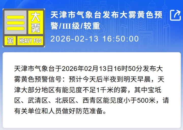 天津市气象台已发布大雾黄色预警信号