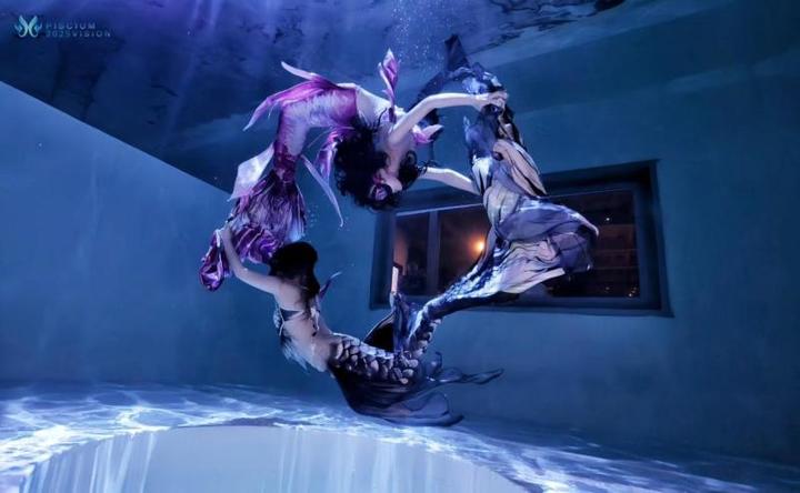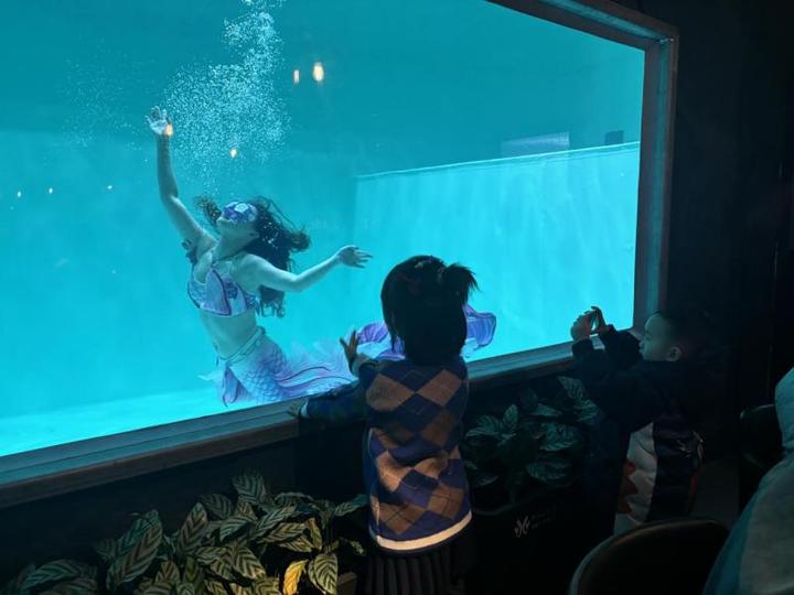 而李梦想和他的潜水团队的精彩,远不止于小店之内。2025年盛夏夜晚,古文化街旁的潞河督运巷圆形仿古潜水池里,总会上演惊艳的美人鱼表演。灵动的尾鳍在水中摇曳,表演者在水中对着大家比心、飞吻,引得过往游客纷纷驻足,争相与水中的“精灵”合影留念,快门声、惊叹声此起彼伏。