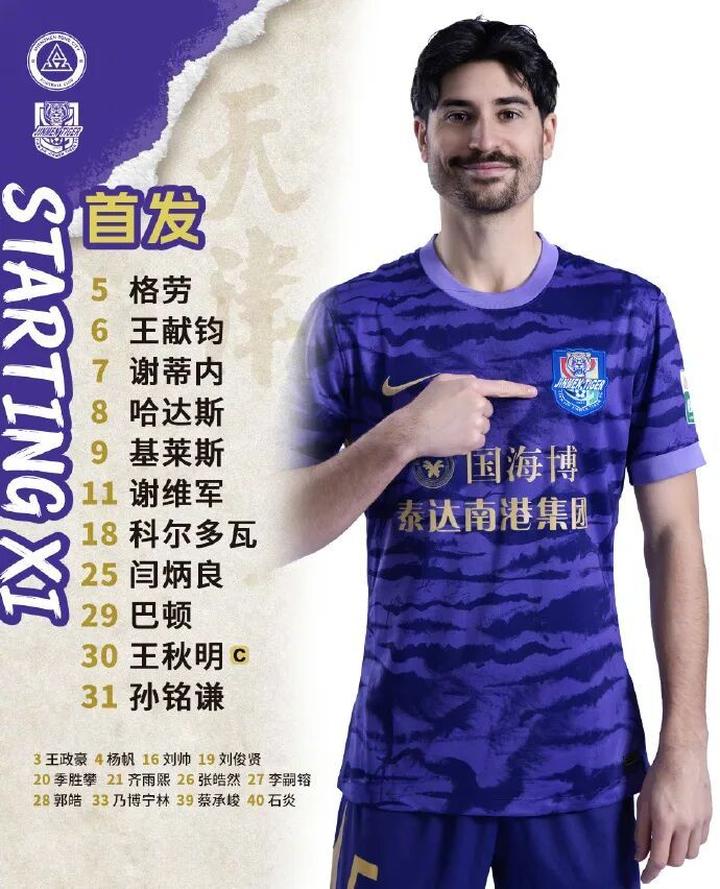 本场比赛,吴兴涵、黄嘉辉因伤缺阵,津门虎的首发阵容也因此不得不做出两处调整,门将闫炳良;三名中卫从左至右分别是王献钧、科尔多瓦、谢维军;孙铭谦和巴顿担任左右边翼卫;中前场没有任何变化,队长王秋明、豪梅·格劳、哈达斯组成前卫线;基莱斯和谢蒂内搭档双前锋。