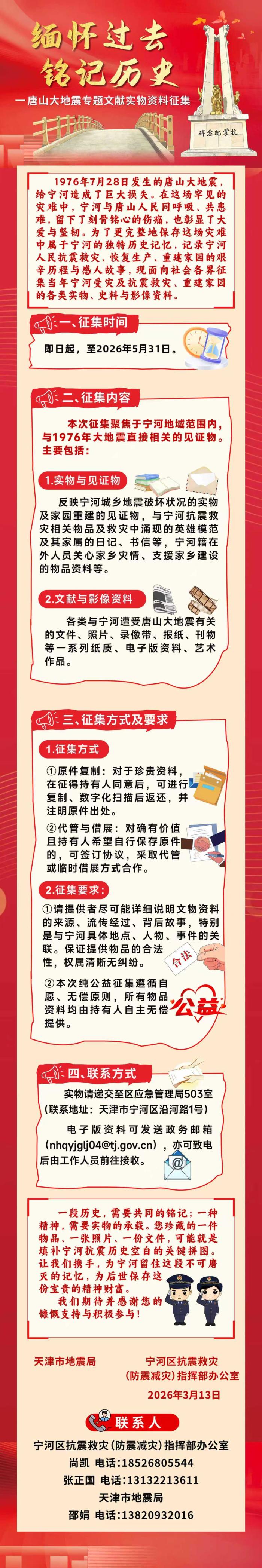津云新闻讯:今年是唐山大地震50周年,宁河与唐山人民同呼吸,共患难,留下了刻骨铭心的伤痛,也彰显了大爱与坚韧。为了更完整地保存这场灾难中属于宁河的独特历史记忆,记录宁河人民抗震救灾、恢复生产、重建家园的艰辛历程与感人故事,天津市地震局现面向社会各界征集当年宁河受灾及抗震救灾,重建家园的各类实物、史料与影像资料。