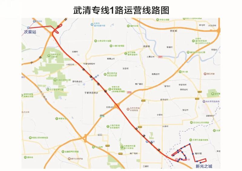 据武清区通途客运有限公司相关负责人介绍,新开通的线路起点位于武清区高村片区,终点为北京次渠地铁站,全程47公里,共设15站,每车配备48个座位。线路开通后,将方便沿线居民的日常出行。