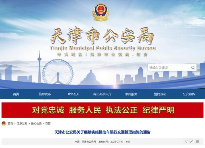 3月17日,天津市公安局网站发布《天津市公安局关于继续实施机动车限行交通管理措施的通告》,经市人民政府批准,自2026年3月30日至2027年3月28日,我市继续实施机动车限行交通管理措施。