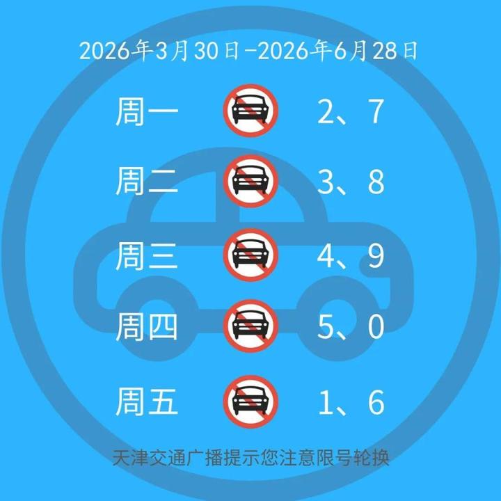 自2026年3月30日至2026年6月28日,星期一至星期五限行机动车号牌尾号(机动车号牌尾号为英文字母的按0号管理,下同)分别为2和7、3和8、4和9、5和0、1和6;