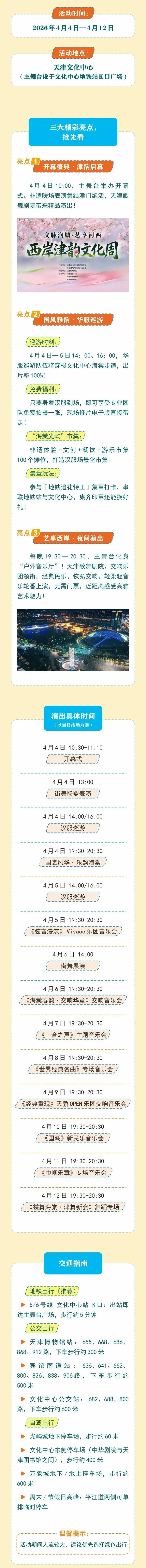 4月4日至12日每晚19点30分至20点30分,天津歌舞剧院与天津交响乐团两大专业院团轮番登台,推出不同主题的音乐演出,涵盖经典民乐、交响乐章、轻音乐、特色器乐独奏等多元艺术形式。
