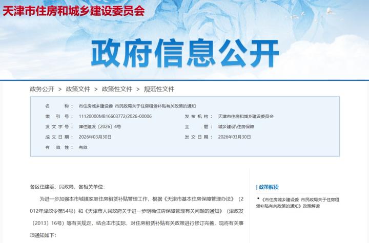 近日,天津对住房租赁补贴政策进行修订完善,明确了各类补贴的申请条件、保障标准及相关管理要求。详情