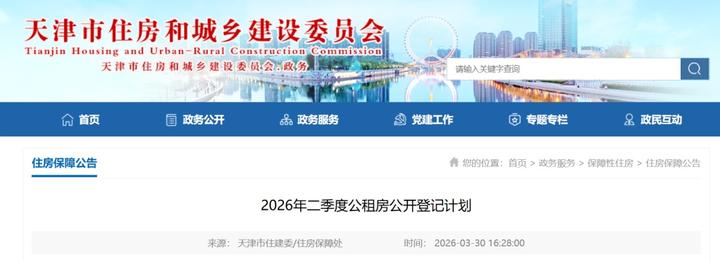 近日,天津市住建委发布《2026年二季度公租房公开登记计划》,其中,摇号配租项目共3953套房源,一居室602套,二居室3351套,涉及河北区、河东区、南开区、东丽区、津南区、北辰区、西青区。河北区、河东区、南开区公租房将于4月13日开始登记。详情