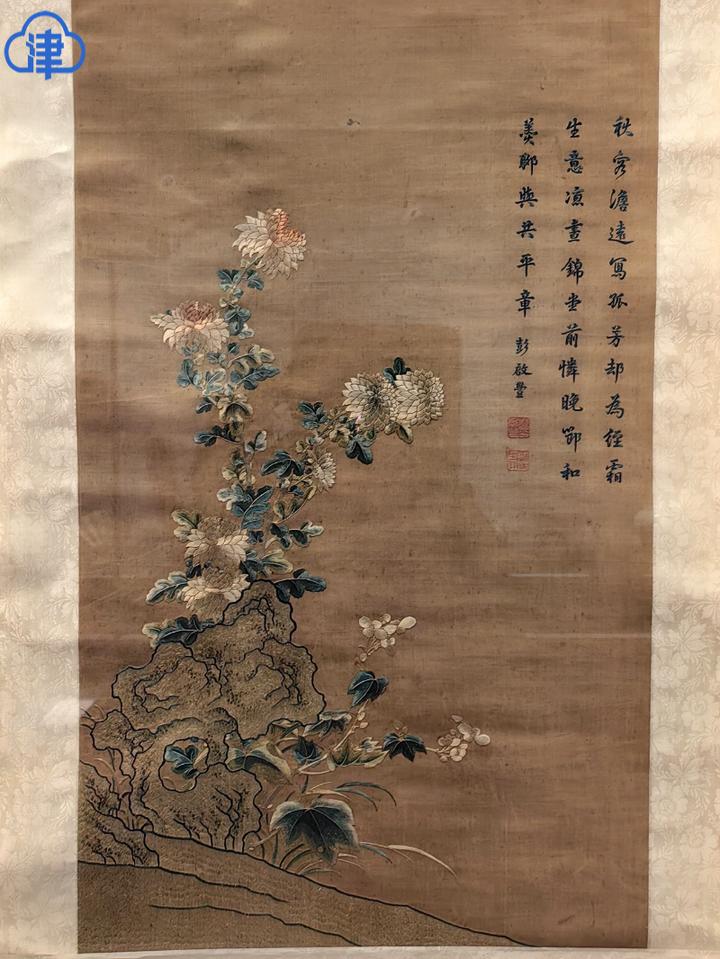 还有一件清代丝绣菊花轴,采用了缂丝的工艺,以针代笔,非常精美。作为梅兰竹菊四君子之一,菊非常高洁,凌霜自行,恬然自处。在人们的日常生活里,菊花常常融入茶和中式糕点之中。重阳节人们喜欢赏菊,这些都让菊花在人们心中产生亲近感。