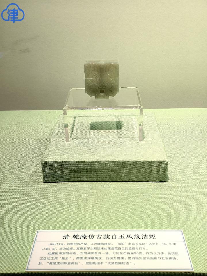 本次展览有几件重点文物值得关注,其中一件是清乾隆仿古款白玉凤纹洁矩。此玉为和田白玉。造型别致严整,工艺娴熟精密。“洁矩”出自《礼记·大学》,洁,约束之意;矩,意为规矩。寓意君子以规矩来约束规范自己的道德与行为。此器由两方筒相连,方筒底部各有一轴,可向左右各展90度,成为长方体,合拢后又恰如工具“矩形”,两面浅浮雕凤纹,合视为兽面。筒内端外壁阴刻楷书五言律诗,款:“乾隆戊申仲夏御制”,底阴刻楷书“大清乾隆仿古”。