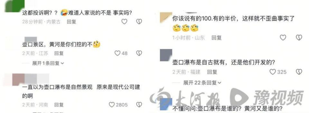 截至3月17日上午11时,该网友喊话母亲河的原始视频互动量已近12万次,而公开道歉视频的互动量也超过8万次。景区的“硬气”投诉引来不少网友反感。尤其是景区自称“壶口瀑布是我司开发的旅游景点”这一说法,引发大量质疑:“怎么就侵犯了名誉权了,拍的镜头是祖国的大好河山!”目前,山西黄河壶口瀑布风景名胜区的官方抖音评论区、直播间均已“沦陷”。